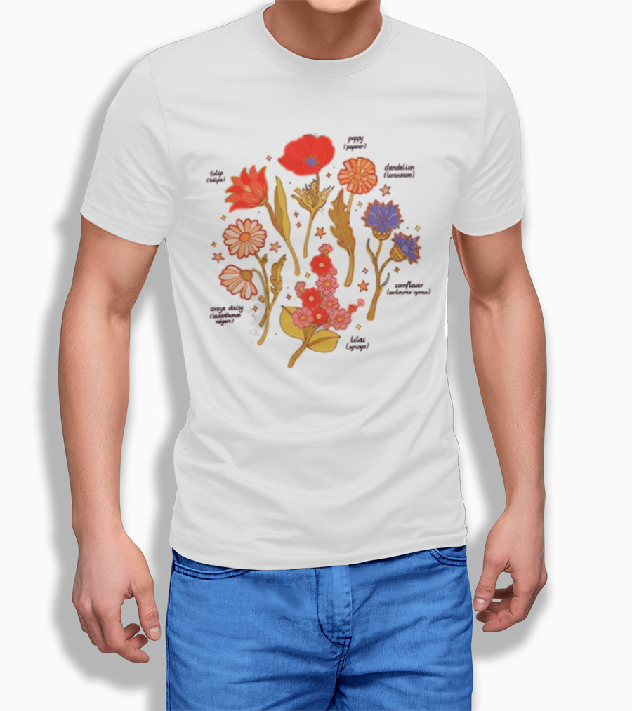 This T-Shirt features Botanical Revival Tulip Poppy Daisy Cosmos Lavender Floral Arrangement print and is constructed from 100% ring-spun cotton fabric with a weight of 4.19 oz/yd² (142 g/m²). The fabric is pre-shrunk during manufacturing, a process intended to minimize dimensional changes after washing according to standard care instructions. Designed with a regular fit for everyday use, it incorporates double-needle stitching at key seams. Please refer to the size chart for detailed measurements.