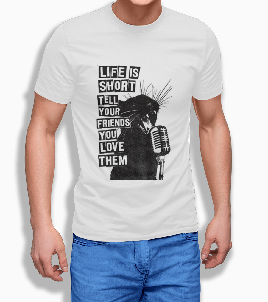 Life Is Short Tell Your Friends You Love Them Black Cat Microphone T-Shirt