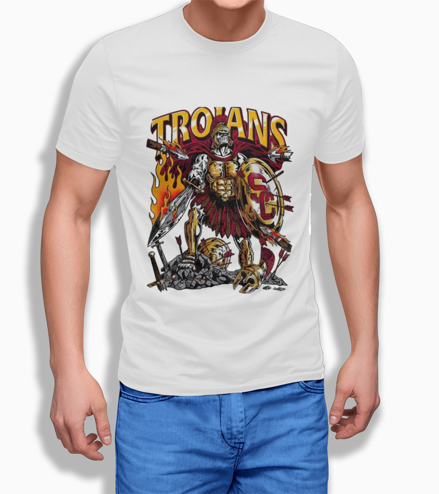 This T-Shirt features Trojans Warrior USC Trojans SC Shield 2025 Football print and is constructed from 100% ring-spun cotton fabric with a weight of 4.19 oz/yd² (142 g/m²). The fabric is pre-shrunk during manufacturing, a process intended to minimize dimensional changes after washing according to standard care instructions. Designed with a regular fit for everyday use, it incorporates double-needle stitching at key seams. Please refer to the size chart for detailed measurements.