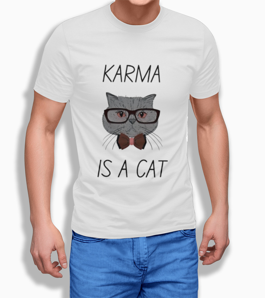 This T-Shirt features Karma Is a Cat Cute Cat with Glasses and Bow Tie print and is constructed from 100% ring-spun cotton fabric with a weight of 4.19 oz/yd² (142 g/m²). The fabric is pre-shrunk during manufacturing, a process intended to minimize dimensional changes after washing according to standard care instructions. Designed with a regular fit for everyday use, it incorporates double-needle stitching at key seams. Please refer to the size chart for detailed measurements.