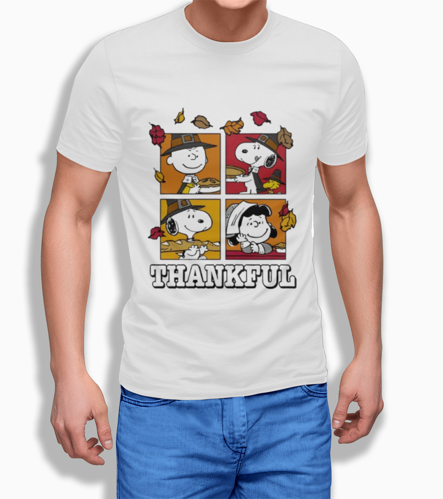 This T-Shirt features Snoopy Pilgrim Thanksgiving Thankful Leaves and Pie print and is constructed from 100% ring-spun cotton fabric with a weight of 4.19 oz/yd² (142 g/m²). The fabric is pre-shrunk during manufacturing, a process intended to minimize dimensional changes after washing according to standard care instructions. Designed with a regular fit for everyday use, it incorporates double-needle stitching at key seams. Please refer to the size chart for detailed measurements.