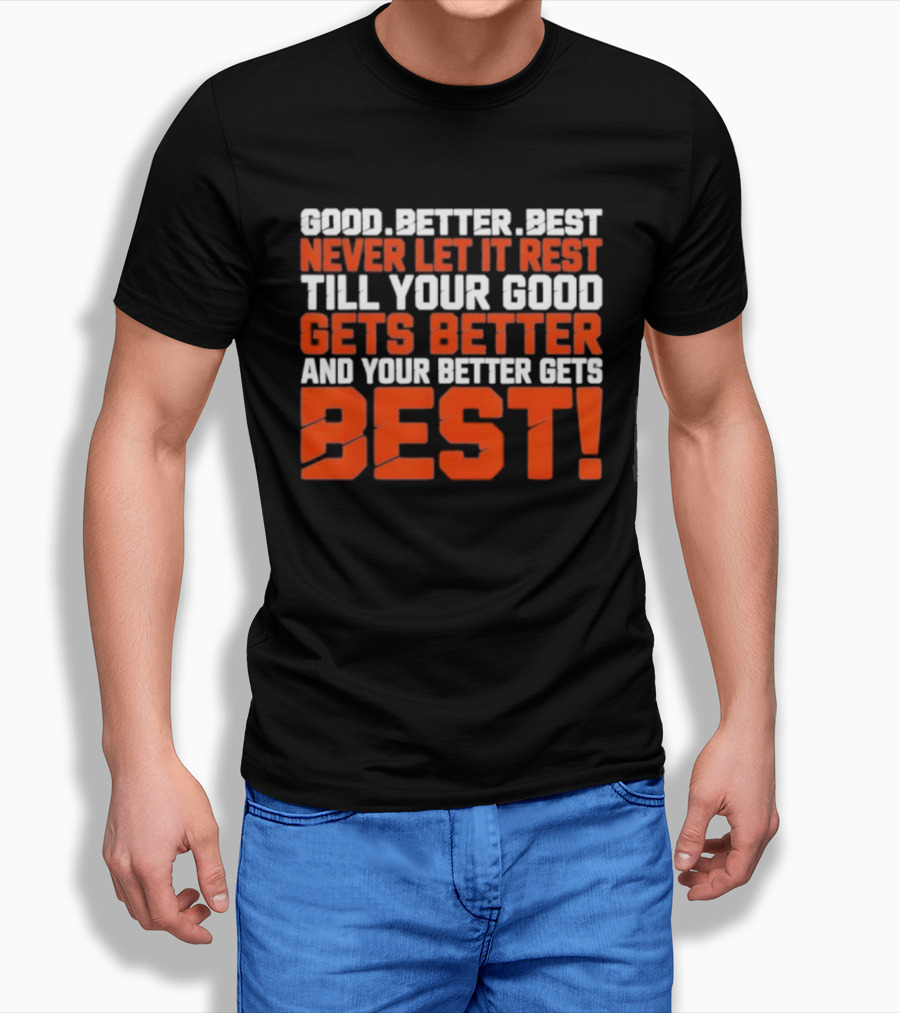 This T-Shirt features Good Better Best Never Let It Rest Till Your Good Gets Better and Your Better Gets Best print and is constructed from 100% ring-spun cotton fabric with a weight of 4.19 oz/yd² (142 g/m²). The fabric is pre-shrunk during manufacturing, a process intended to minimize dimensional changes after washing according to standard care instructions. Designed with a regular fit for everyday use, it incorporates double-needle stitching at key seams. Please refer to the size chart for detailed measurements.