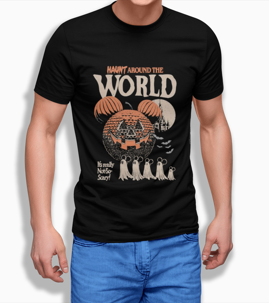 This T-Shirt features Mickey Inspired Pumpkin Ghosts Happy Haunt Around The World Halloween print and is constructed from 100% ring-spun cotton fabric with a weight of 4.19 oz/yd² (142 g/m²). The fabric is pre-shrunk during manufacturing, a process intended to minimize dimensional changes after washing according to standard care instructions. Designed with a regular fit for everyday use, it incorporates double-needle stitching at key seams. Please refer to the size chart for detailed measurements.