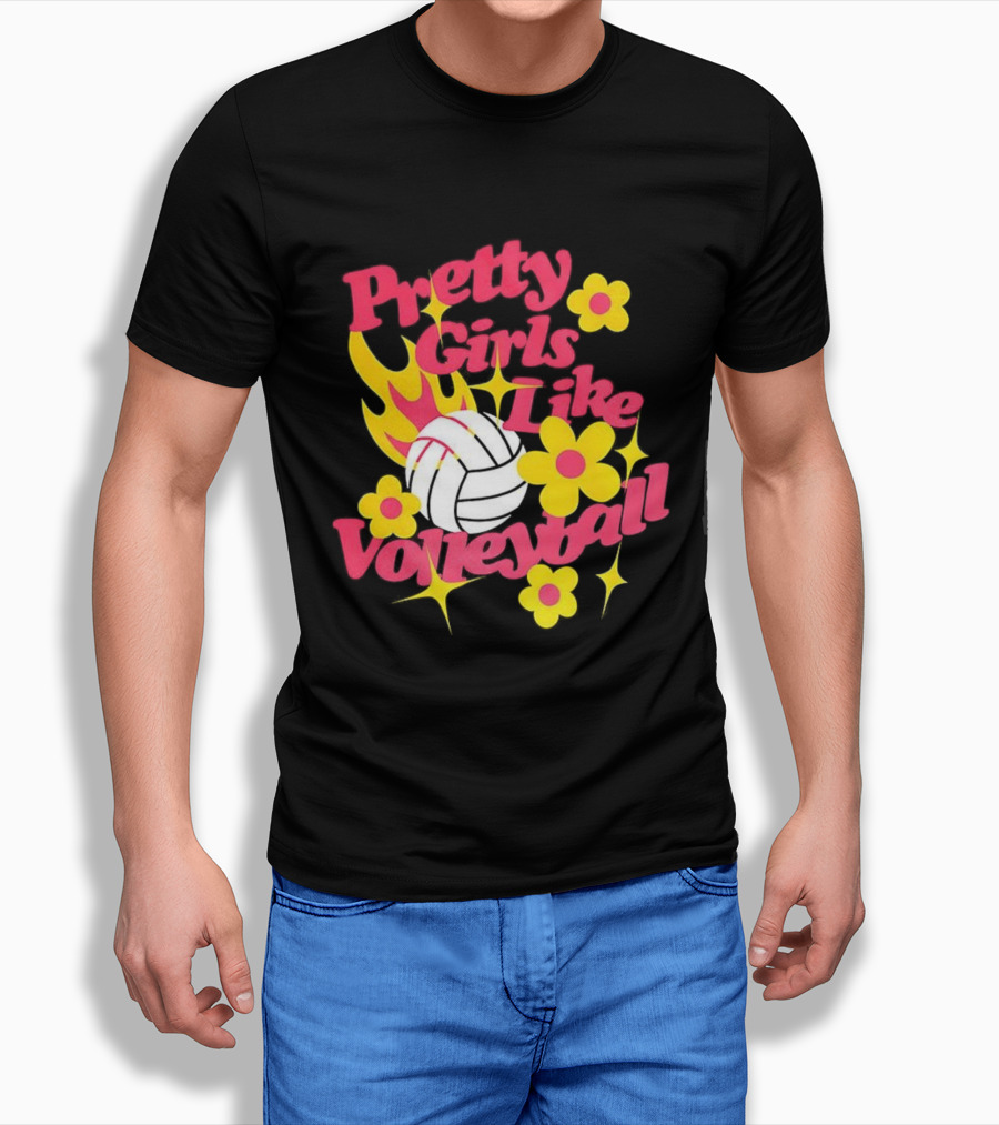 Pretty Girls Like Volleyball Flowers Yellow Pink Volleyball Floral Design T-Shirt