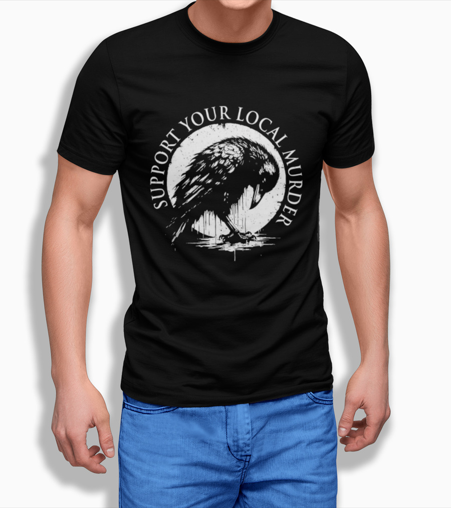 This T-Shirt features Support Your Local Murder Crow Illustration print and is constructed from 100% ring-spun cotton fabric with a weight of 4.19 oz/yd² (142 g/m²). The fabric is pre-shrunk during manufacturing, a process intended to minimize dimensional changes after washing according to standard care instructions. Designed with a regular fit for everyday use, it incorporates double-needle stitching at key seams. Please refer to the size chart for detailed measurements.
