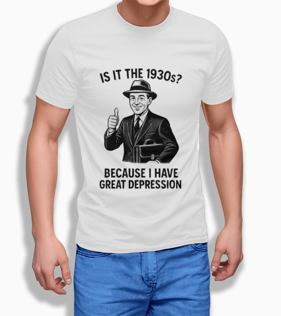 This T-Shirt features Is It the 1930s Because I Have Great Depression Thumbs Up Suit Briefcase print and is constructed from 100% ring-spun cotton fabric with a weight of 4.19 oz/yd² (142 g/m²). The fabric is pre-shrunk during manufacturing, a process intended to minimize dimensional changes after washing according to standard care instructions. Designed with a regular fit for everyday use, it incorporates double-needle stitching at key seams. Please refer to the size chart for detailed measurements.