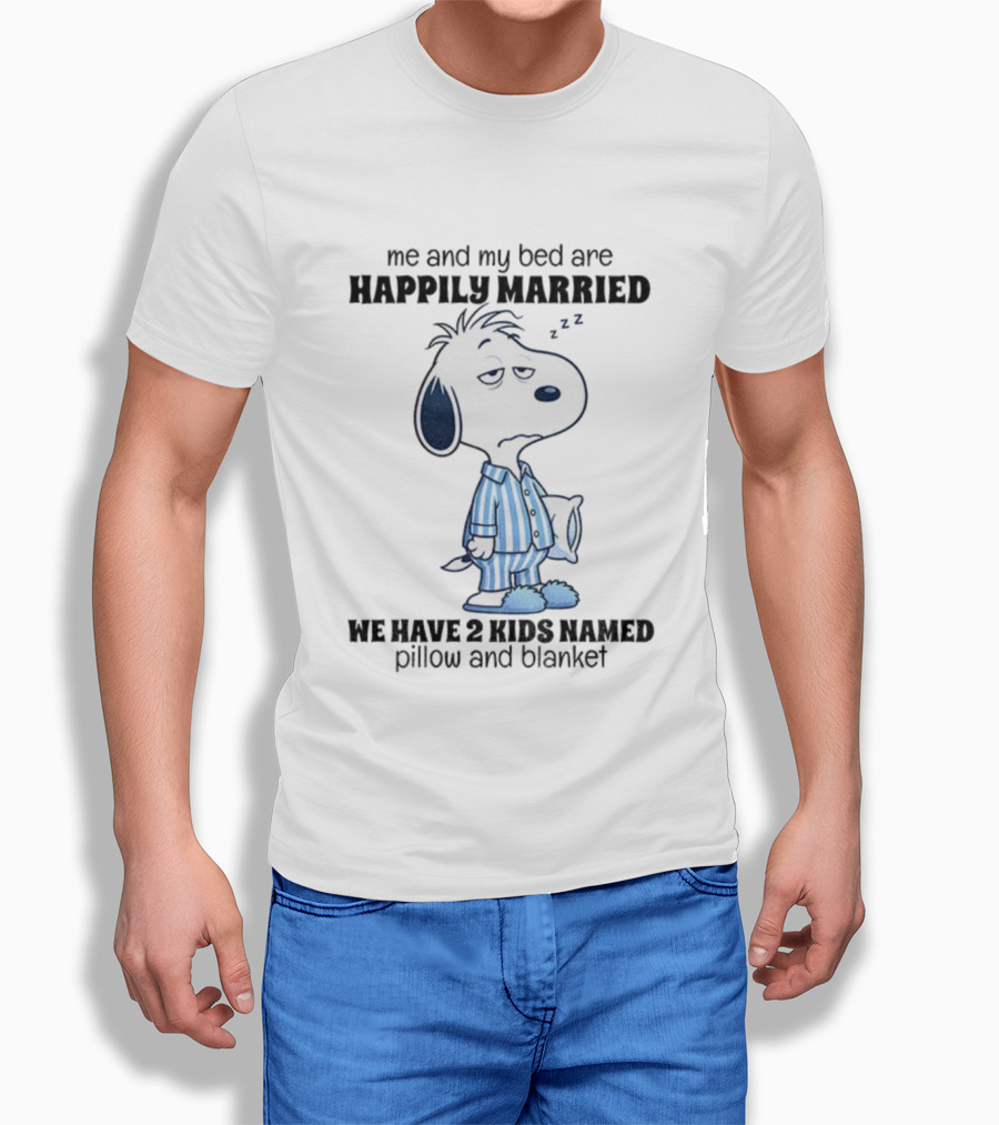 Snoopy Me And My Bed Happily Married ZZ We Have 2 Kids Named Pillow And Blanket T-Shirt
