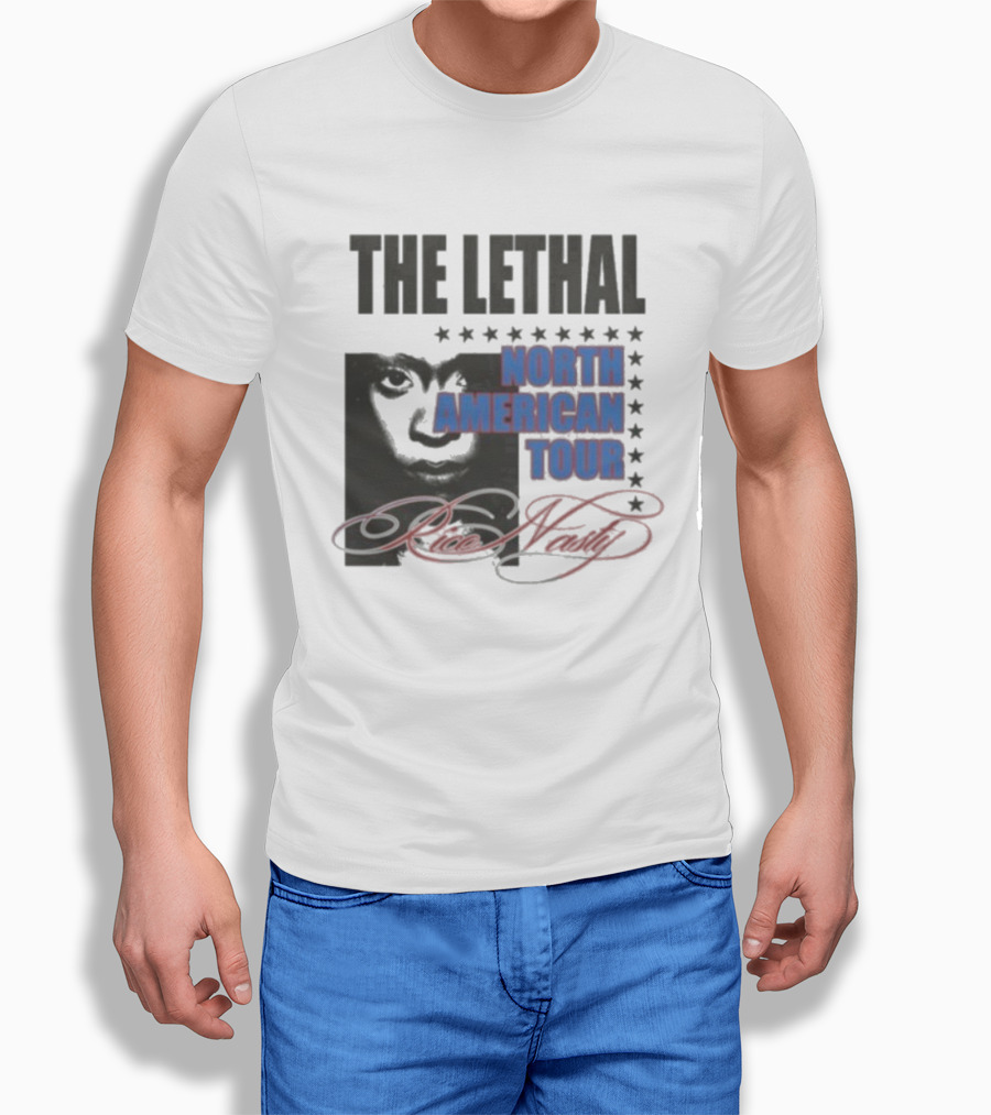 This T-Shirt features Rico Nasty The Lethal North American Tour 2025 2026 Stars Smiling Face print and is constructed from 100% ring-spun cotton fabric with a weight of 4.19 oz/yd² (142 g/m²). The fabric is pre-shrunk during manufacturing, a process intended to minimize dimensional changes after washing according to standard care instructions. Designed with a regular fit for everyday use, it incorporates double-needle stitching at key seams. Please refer to the size chart for detailed measurements.