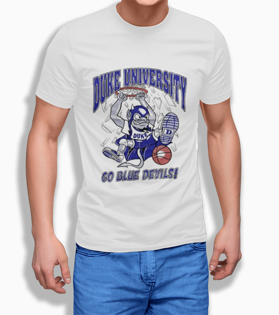 This T-Shirt features Duke University Blue Devils Basketball Dunking Mascot Go Blue Devils print and is constructed from 100% ring-spun cotton fabric with a weight of 4.19 oz/yd² (142 g/m²). The fabric is pre-shrunk during manufacturing, a process intended to minimize dimensional changes after washing according to standard care instructions. Designed with a regular fit for everyday use, it incorporates double-needle stitching at key seams. Please refer to the size chart for detailed measurements.