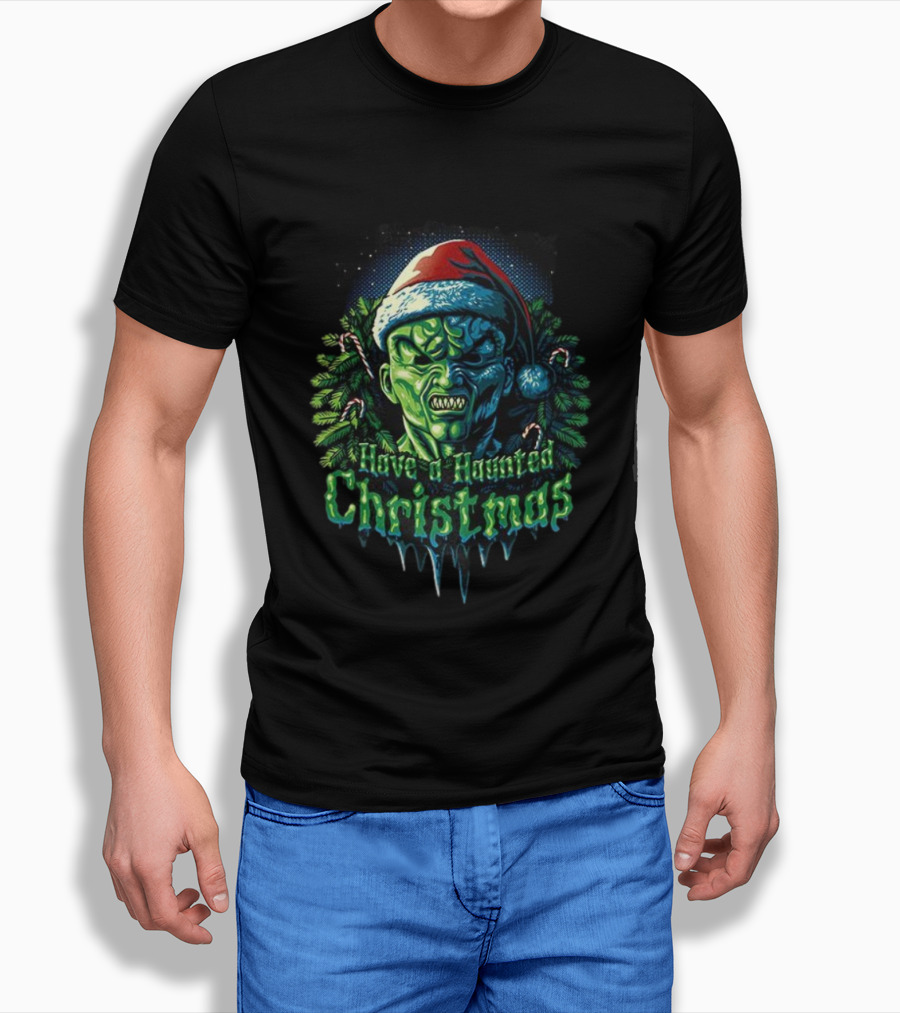 This T-Shirt features The Haunted Mask Have a Haunted Christmas Horror Santa Green Monster print and is constructed from 100% ring-spun cotton fabric with a weight of 4.19 oz/yd² (142 g/m²). The fabric is pre-shrunk during manufacturing, a process intended to minimize dimensional changes after washing according to standard care instructions. Designed with a regular fit for everyday use, it incorporates double-needle stitching at key seams. Please refer to the size chart for detailed measurements.