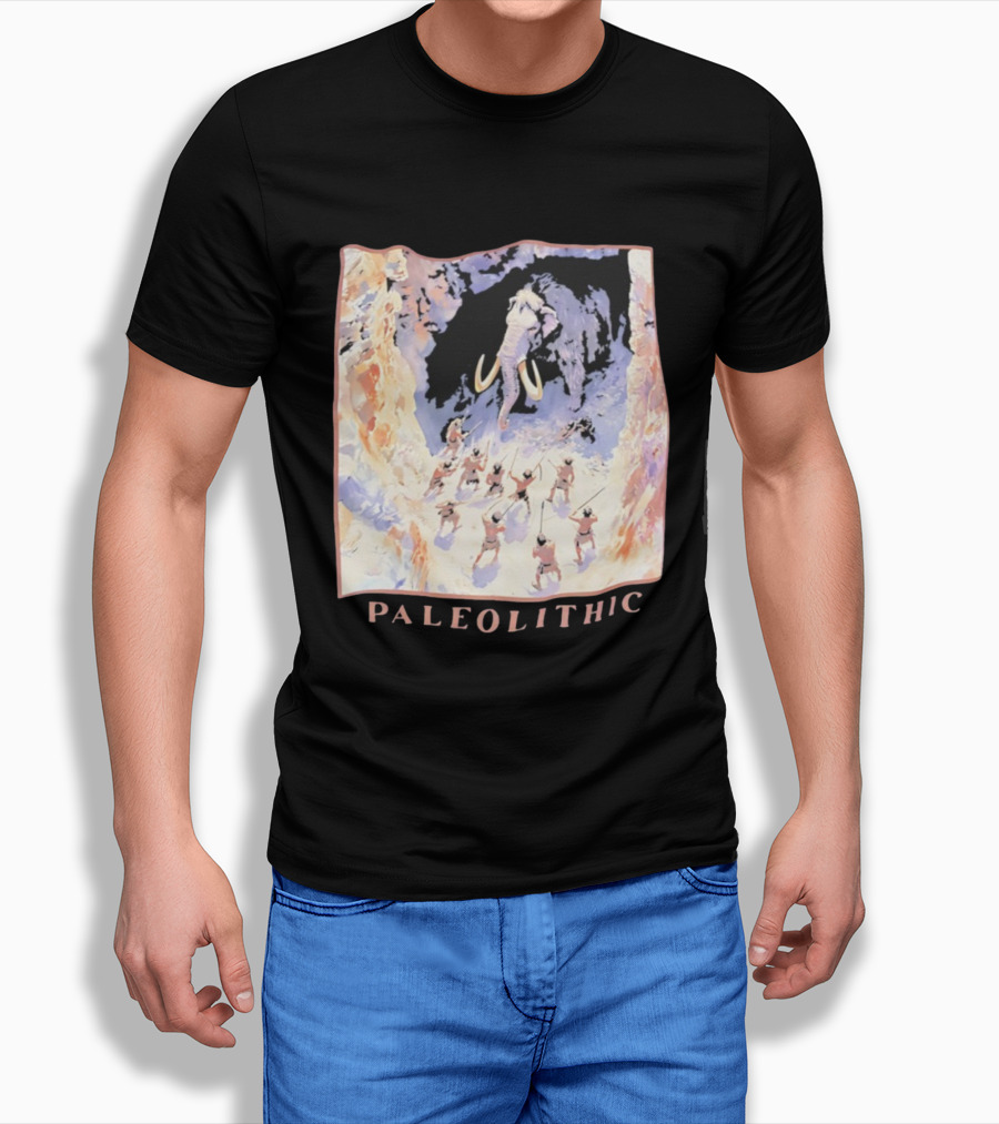 This T-Shirt features Paleolithic Mammoth Hunters Cave Painting print and is constructed from 100% ring-spun cotton fabric with a weight of 4.19 oz/yd² (142 g/m²). The fabric is pre-shrunk during manufacturing, a process intended to minimize dimensional changes after washing according to standard care instructions. Designed with a regular fit for everyday use, it incorporates double-needle stitching at key seams. Please refer to the size chart for detailed measurements.