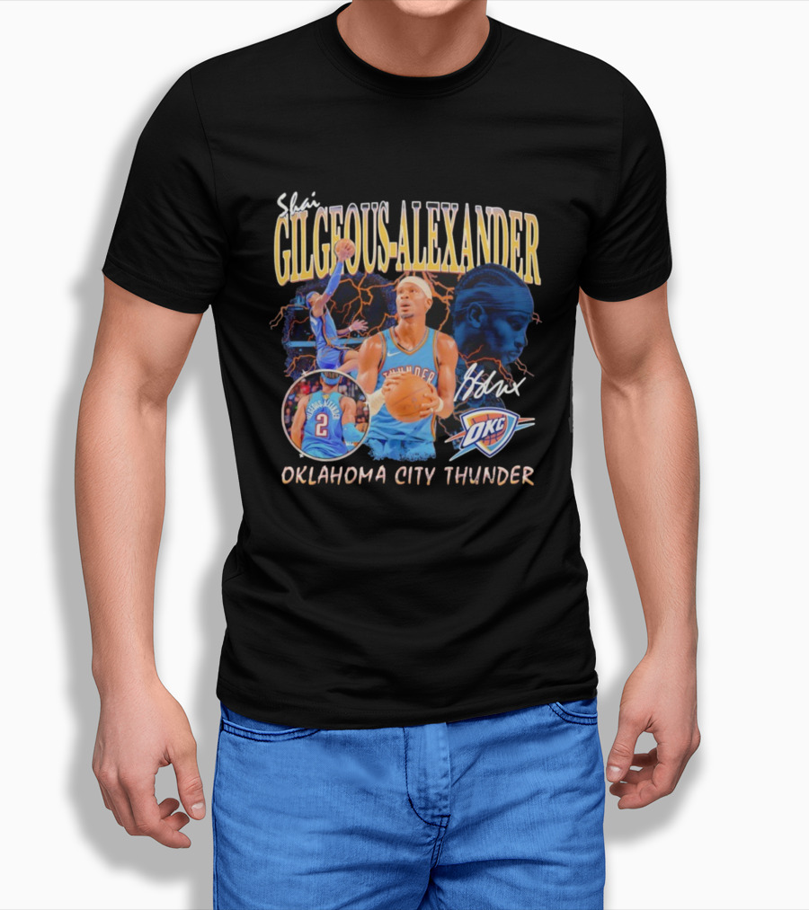 This T-Shirt features Gilgeous-Alexander Thunder Oklahoma City Basketball Player OKC print and is constructed from 100% ring-spun cotton fabric with a weight of 4.19 oz/yd² (142 g/m²). The fabric is pre-shrunk during manufacturing, a process intended to minimize dimensional changes after washing according to standard care instructions. Designed with a regular fit for everyday use, it incorporates double-needle stitching at key seams. Please refer to the size chart for detailed measurements.