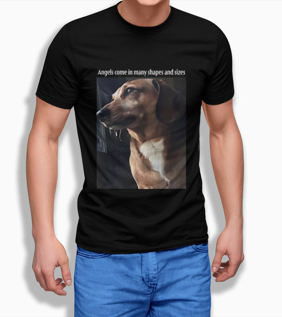 This T-Shirt features Angels Come in Many Shapes and Sizes Dog Portrait print and is constructed from 100% ring-spun cotton fabric with a weight of 4.19 oz/yd² (142 g/m²). The fabric is pre-shrunk during manufacturing, a process intended to minimize dimensional changes after washing according to standard care instructions. Designed with a regular fit for everyday use, it incorporates double-needle stitching at key seams. Please refer to the size chart for detailed measurements.