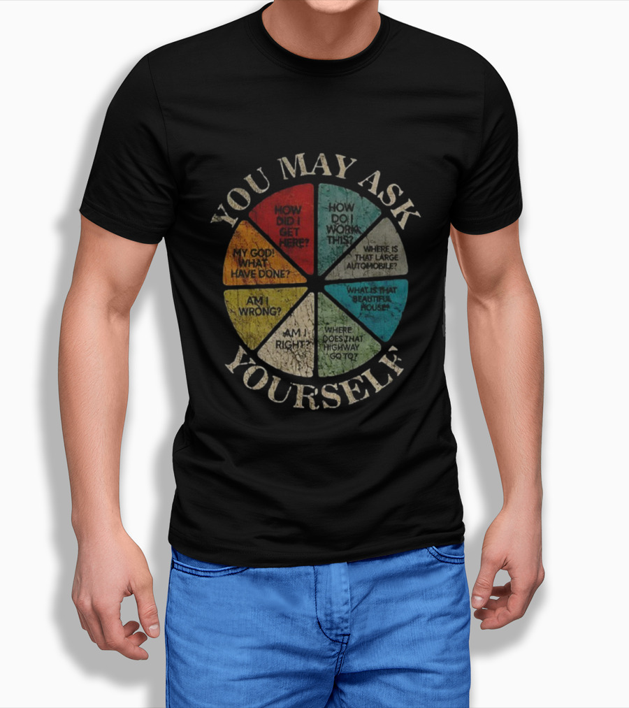 This T-Shirt features You May Ask Yourself How Did I Get Here How Do I Work This Large Automobile print and is constructed from 100% ring-spun cotton fabric with a weight of 4.19 oz/yd² (142 g/m²). The fabric is pre-shrunk during manufacturing, a process intended to minimize dimensional changes after washing according to standard care instructions. Designed with a regular fit for everyday use, it incorporates double-needle stitching at key seams. Please refer to the size chart for detailed measurements.