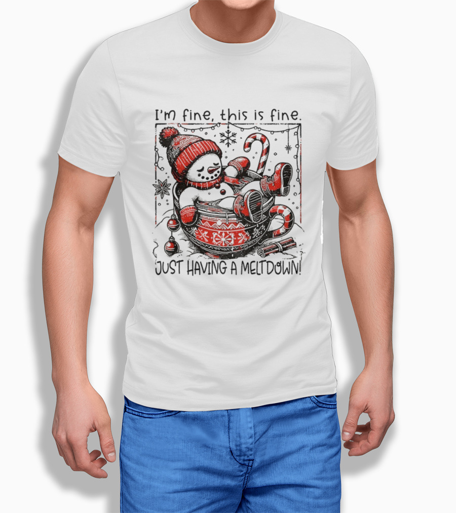 This T-Shirt features Snowman Santa Hat I'm Fine This Is Fine Just Having A Meltdown Merry Christmas print and is constructed from 100% ring-spun cotton fabric with a weight of 4.19 oz/yd² (142 g/m²). The fabric is pre-shrunk during manufacturing, a process intended to minimize dimensional changes after washing according to standard care instructions. Designed with a regular fit for everyday use, it incorporates double-needle stitching at key seams. Please refer to the size chart for detailed measurements.