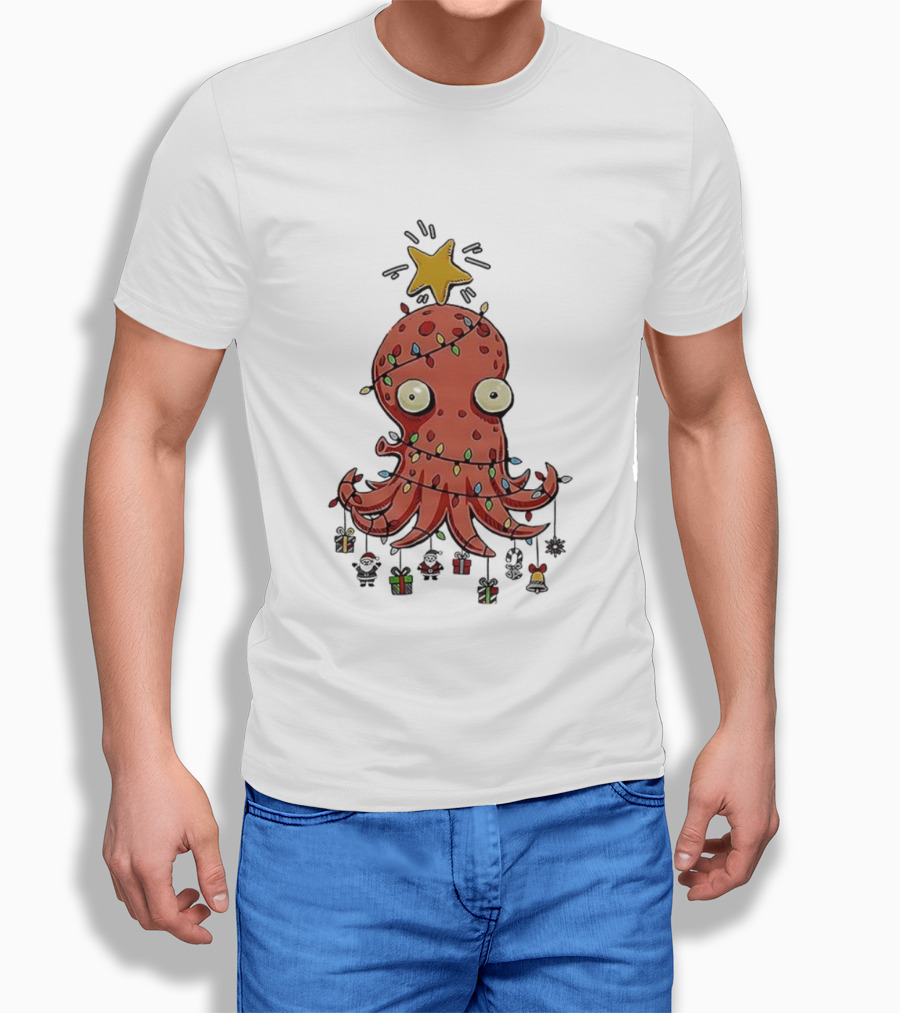 This T-Shirt features Christmas Octopus Tree Wrapped in Light Cords with Star and Decorations print and is constructed from 100% ring-spun cotton fabric with a weight of 4.19 oz/yd² (142 g/m²). The fabric is pre-shrunk during manufacturing, a process intended to minimize dimensional changes after washing according to standard care instructions. Designed with a regular fit for everyday use, it incorporates double-needle stitching at key seams. Please refer to the size chart for detailed measurements.