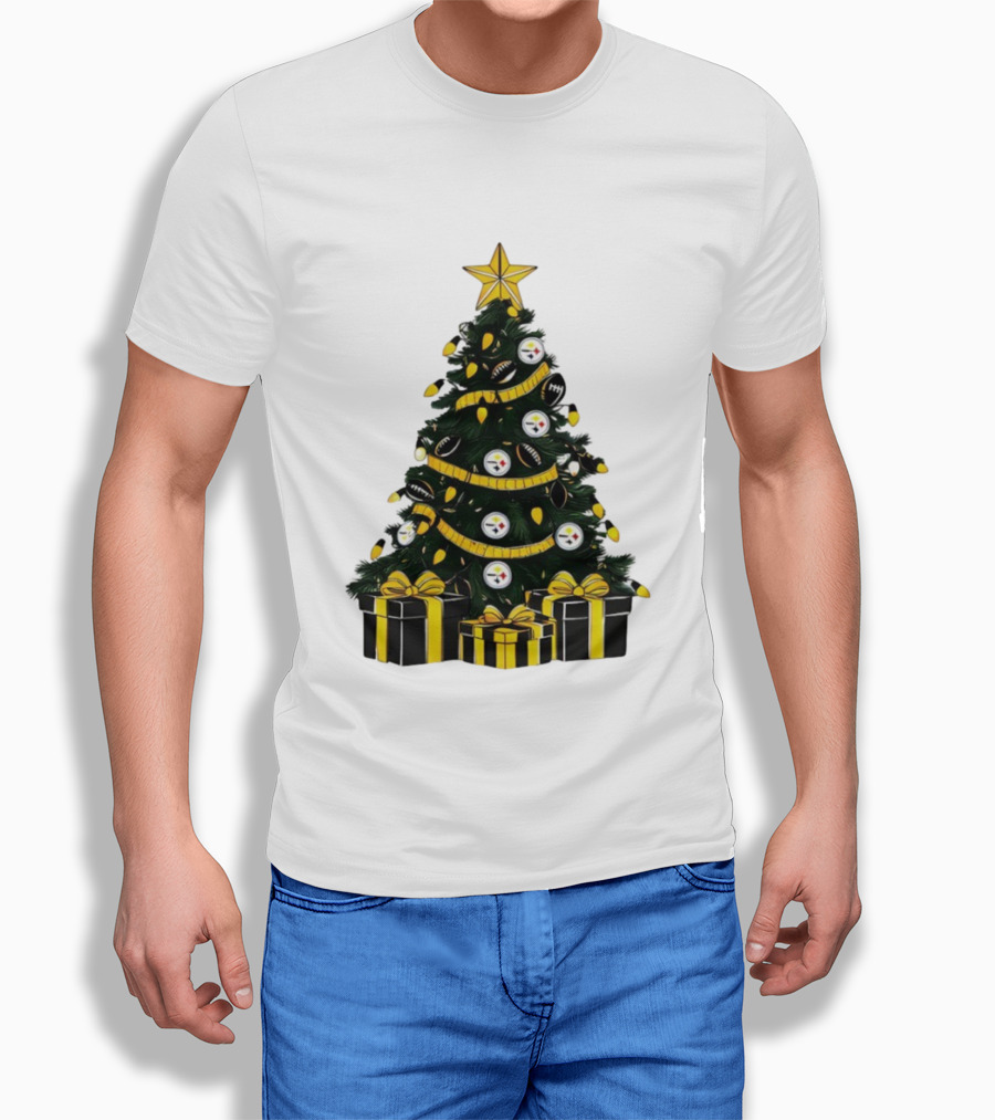 This T-Shirt features Pittsburgh Steelers Christmas Tree Holiday Decor NFL Football Gifts print and is constructed from 100% ring-spun cotton fabric with a weight of 4.19 oz/yd² (142 g/m²). The fabric is pre-shrunk during manufacturing, a process intended to minimize dimensional changes after washing according to standard care instructions. Designed with a regular fit for everyday use, it incorporates double-needle stitching at key seams. Please refer to the size chart for detailed measurements.