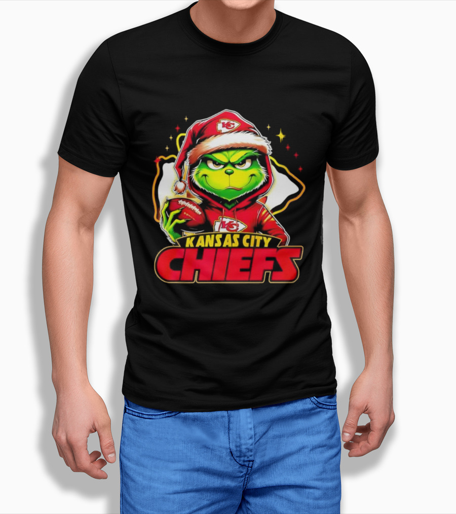 Grinch In Santa Hat Holding Football Kansas City Chiefs T-Shirt