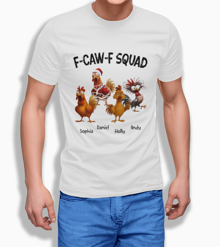 This T-Shirt features F-CAW-F Squad Funny Custom Names Sophia Daniel Holly Andy Ornament print and is constructed from 100% ring-spun cotton fabric with a weight of 4.19 oz/yd² (142 g/m²). The fabric is pre-shrunk during manufacturing, a process intended to minimize dimensional changes after washing according to standard care instructions. Designed with a regular fit for everyday use, it incorporates double-needle stitching at key seams. Please refer to the size chart for detailed measurements.