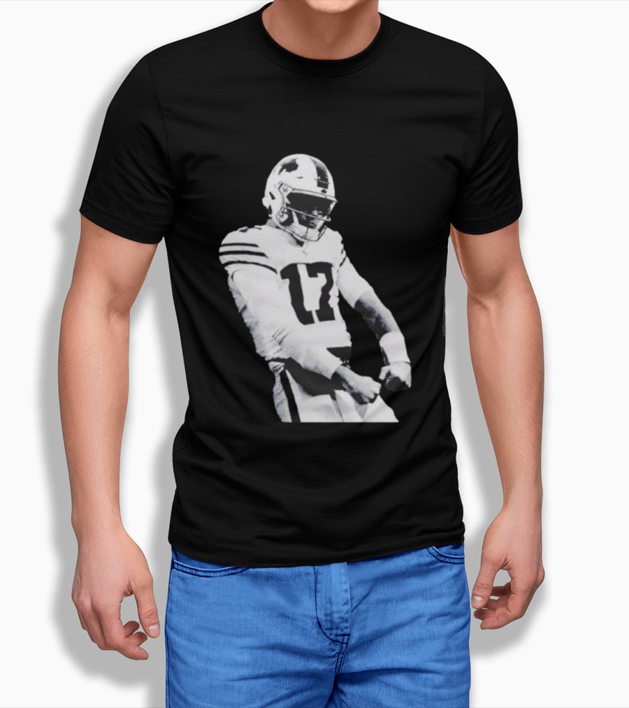 This T-Shirt features Buffalo Bills Flex Hey-ey-Ey-ey Number 17 Football Celebration print and is constructed from 100% ring-spun cotton fabric with a weight of 4.19 oz/yd² (142 g/m²). The fabric is pre-shrunk during manufacturing, a process intended to minimize dimensional changes after washing according to standard care instructions. Designed with a regular fit for everyday use, it incorporates double-needle stitching at key seams. Please refer to the size chart for detailed measurements.