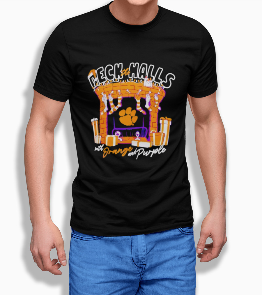 Clemson Tigers Deck The Halls With Orange And Purple Christmas Fireplace Stockings Gifts T-Shirt