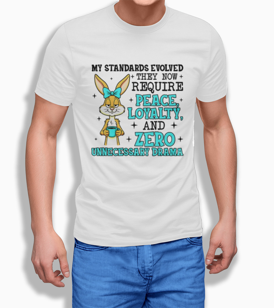 This T-Shirt features Rabbit With Coffee My Standards Evolved Require Peace Loyalty Zero Unnecessary Drama print and is constructed from 100% ring-spun cotton fabric with a weight of 4.19 oz/yd² (142 g/m²). The fabric is pre-shrunk during manufacturing, a process intended to minimize dimensional changes after washing according to standard care instructions. Designed with a regular fit for everyday use, it incorporates double-needle stitching at key seams. Please refer to the size chart for detailed measurements.