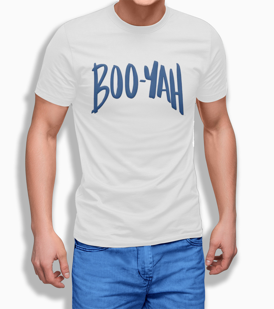 This T-Shirt features Boo-Yah Bold Blue Lettering print and is constructed from 100% ring-spun cotton fabric with a weight of 4.19 oz/yd² (142 g/m²). The fabric is pre-shrunk during manufacturing, a process intended to minimize dimensional changes after washing according to standard care instructions. Designed with a regular fit for everyday use, it incorporates double-needle stitching at key seams. Please refer to the size chart for detailed measurements.