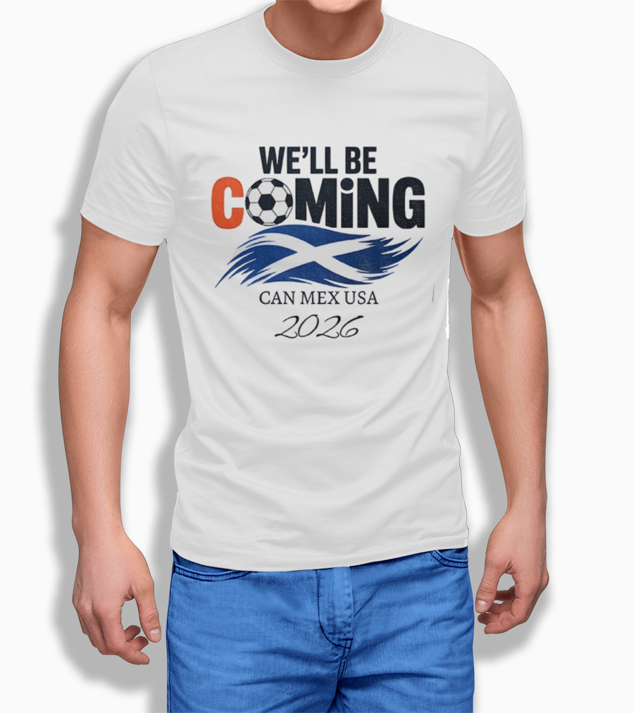 This T-Shirt features Scotland We'll Be Coming CAN MEX USA Flag Soccer 2026 print and is constructed from 100% ring-spun cotton fabric with a weight of 4.19 oz/yd² (142 g/m²). The fabric is pre-shrunk during manufacturing, a process intended to minimize dimensional changes after washing according to standard care instructions. Designed with a regular fit for everyday use, it incorporates double-needle stitching at key seams. Please refer to the size chart for detailed measurements.