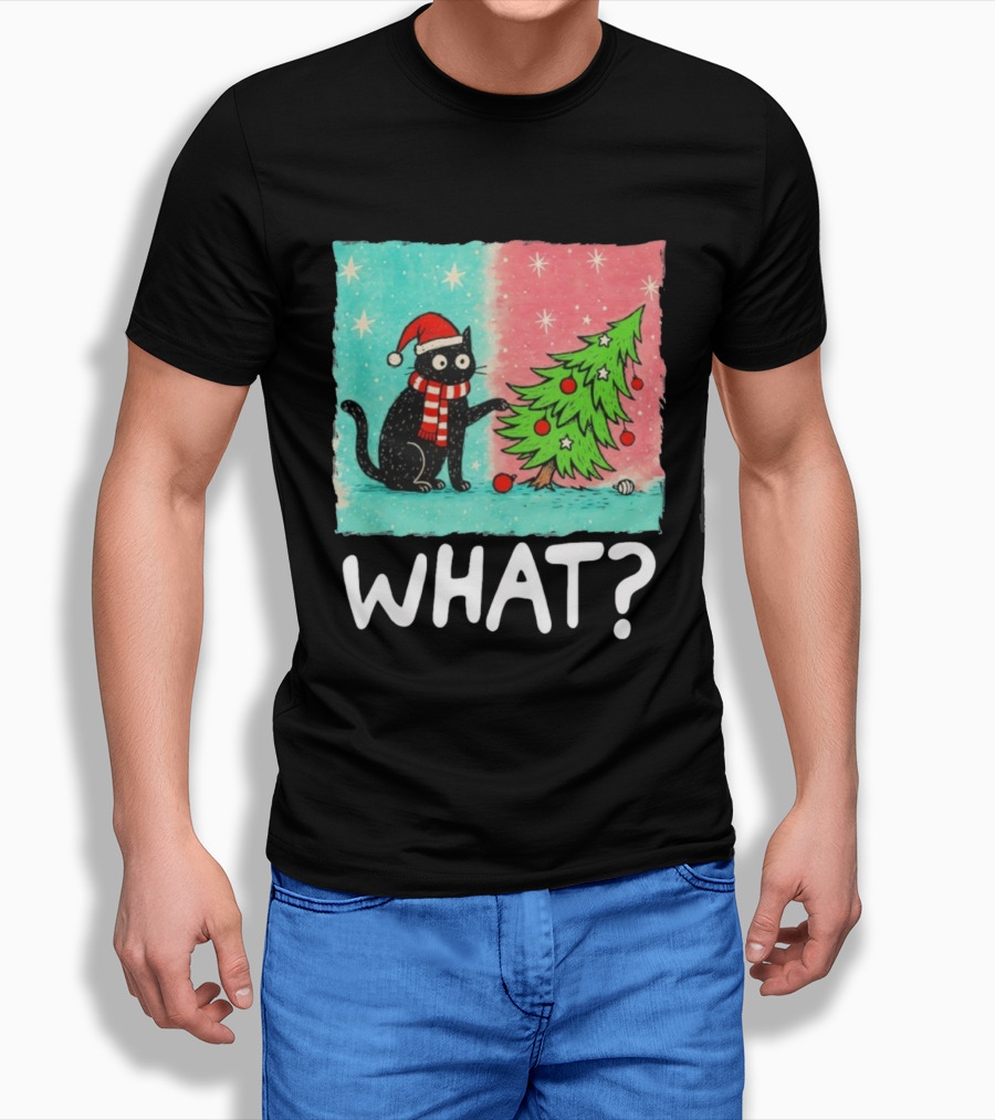 This T-Shirt features Black Cat Santa Hat Pushing Christmas Tree What print and is constructed from 100% ring-spun cotton fabric with a weight of 4.19 oz/yd² (142 g/m²). The fabric is pre-shrunk during manufacturing, a process intended to minimize dimensional changes after washing according to standard care instructions. Designed with a regular fit for everyday use, it incorporates double-needle stitching at key seams. Please refer to the size chart for detailed measurements.