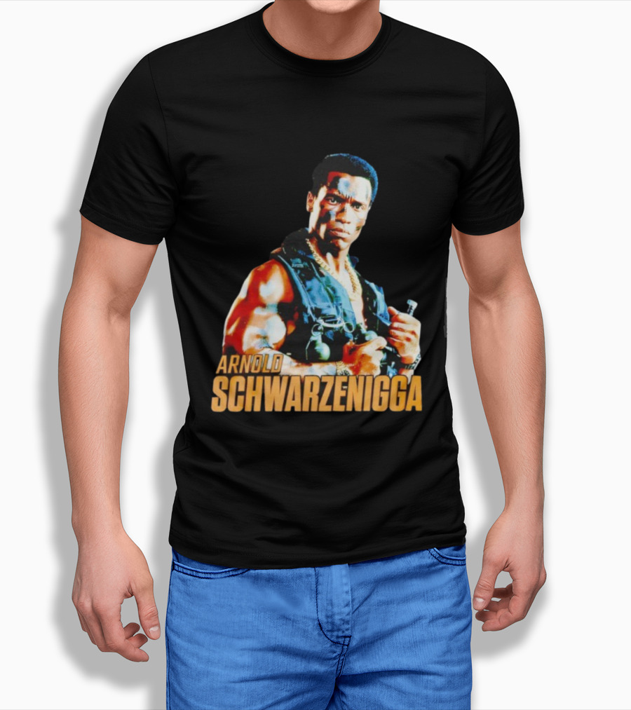 This T-Shirt features Arnold Schwarzenigga print and is constructed from 100% ring-spun cotton fabric with a weight of 4.19 oz/yd² (142 g/m²). The fabric is pre-shrunk during manufacturing, a process intended to minimize dimensional changes after washing according to standard care instructions. Designed with a regular fit for everyday use, it incorporates double-needle stitching at key seams. Please refer to the size chart for detailed measurements.