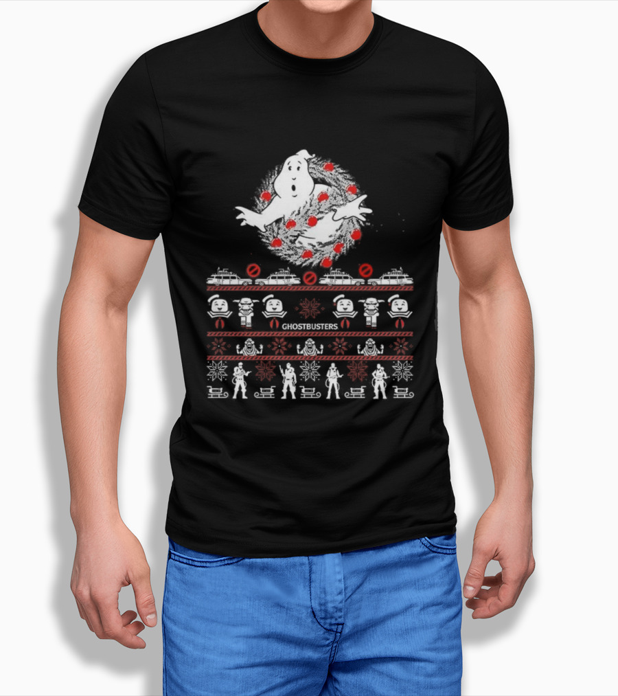 Ghostbusters Movie Christmas Sweater Style Ectomobile And Marshmallow Man T-Shirt