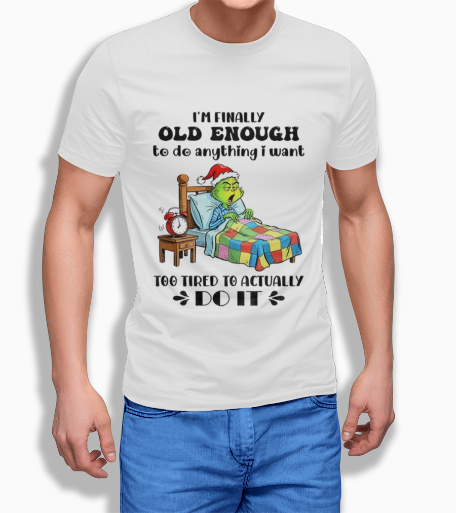 This T-Shirt features I'm Finally Old Enough to Do Anything I Want Too Tired to Actually Do It Grinch Christmas Santa Hat print and is constructed from 100% ring-spun cotton fabric with a weight of 4.19 oz/yd² (142 g/m²). The fabric is pre-shrunk during manufacturing, a process intended to minimize dimensional changes after washing according to standard care instructions. Designed with a regular fit for everyday use, it incorporates double-needle stitching at key seams. Please refer to the size chart for detailed measurements.