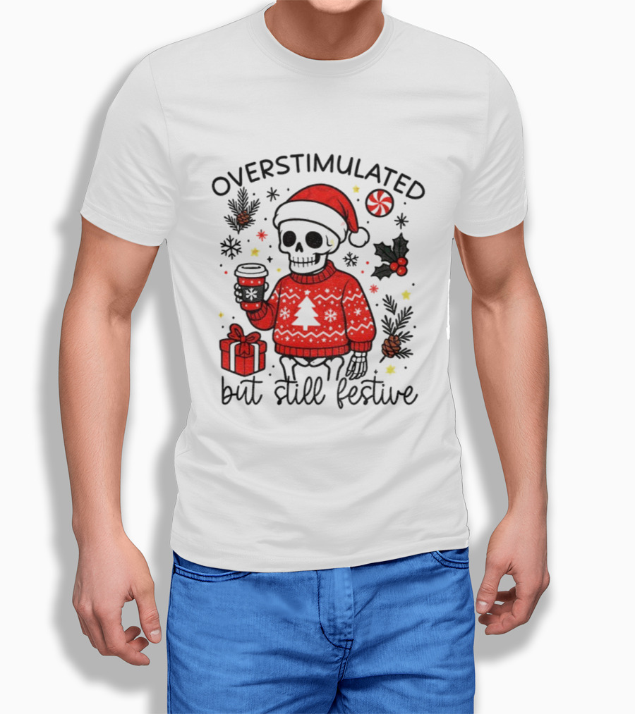 Overstimulated But Still Festive Skeleton With Santa Hat Christmas 2025 T-Shirt