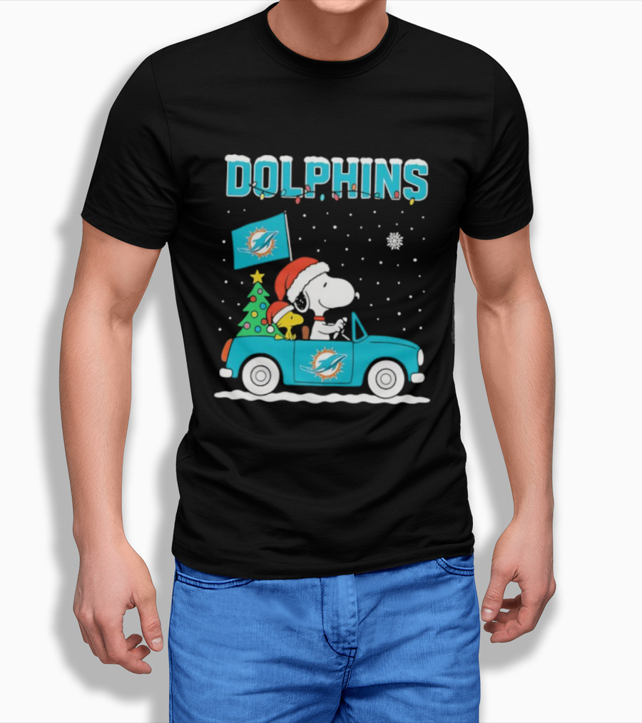 Snoopy WoodStock Santa Christmas Miami Dolphins Car Holiday Scene T-Shirt