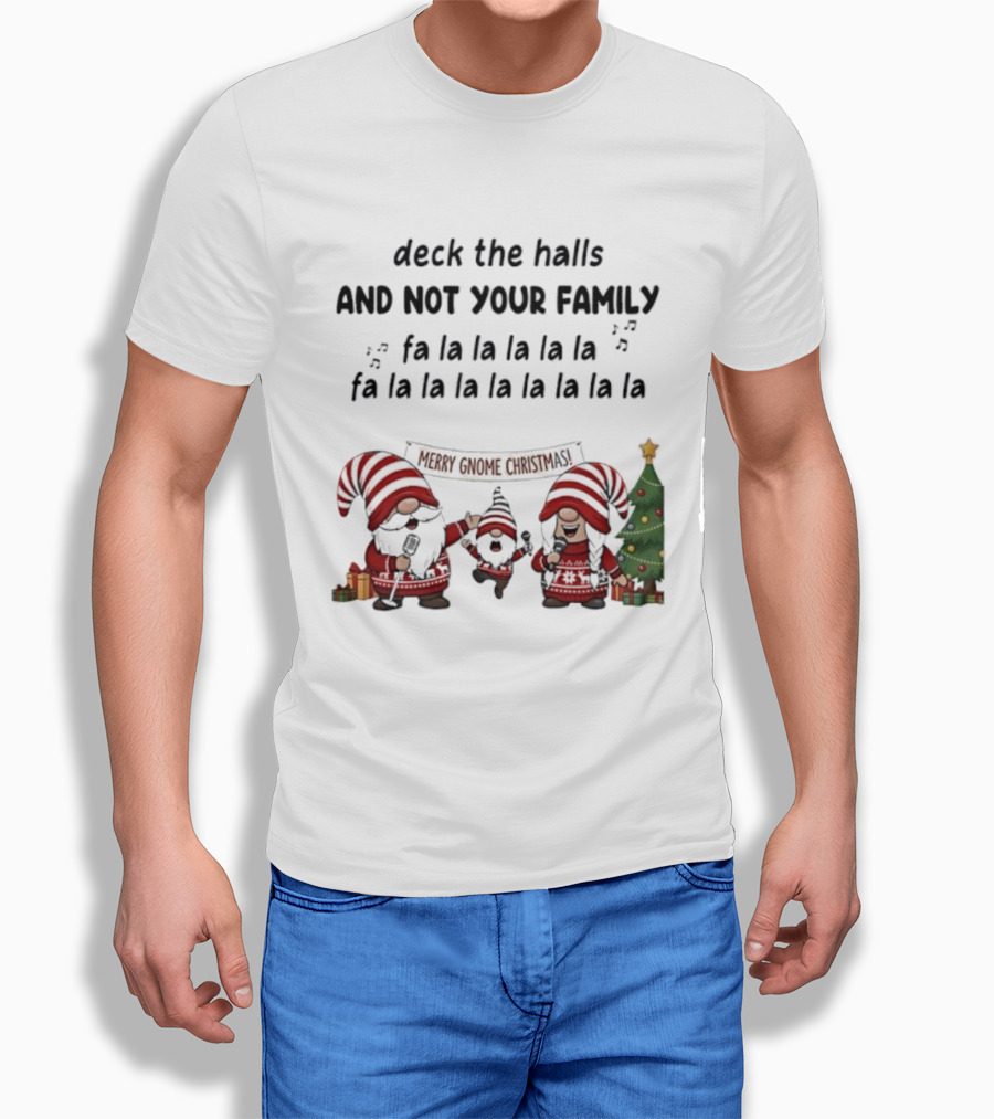 This T-Shirt features Deck the Halls And Not Your Family Merry Gnome Christmas Tree Fa La La print and is constructed from 100% ring-spun cotton fabric with a weight of 4.19 oz/yd² (142 g/m²). The fabric is pre-shrunk during manufacturing, a process intended to minimize dimensional changes after washing according to standard care instructions. Designed with a regular fit for everyday use, it incorporates double-needle stitching at key seams. Please refer to the size chart for detailed measurements.