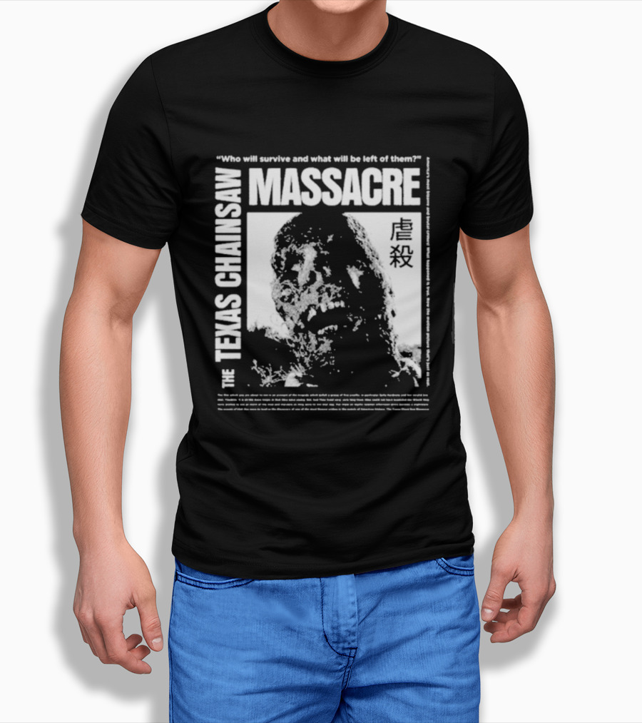 This T-Shirt features The Texas Chainsaw Massacre Who Will Survive What Will Be Left Of Them Drippy Corpse Japanese Text print and is constructed from 100% ring-spun cotton fabric with a weight of 4.19 oz/yd² (142 g/m²). The fabric is pre-shrunk during manufacturing, a process intended to minimize dimensional changes after washing according to standard care instructions. Designed with a regular fit for everyday use, it incorporates double-needle stitching at key seams. Please refer to the size chart for detailed measurements.