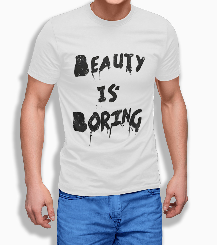 This T-Shirt features Beauty Is Boring Jenko print and is constructed from 100% ring-spun cotton fabric with a weight of 4.19 oz/yd² (142 g/m²). The fabric is pre-shrunk during manufacturing, a process intended to minimize dimensional changes after washing according to standard care instructions. Designed with a regular fit for everyday use, it incorporates double-needle stitching at key seams. Please refer to the size chart for detailed measurements.