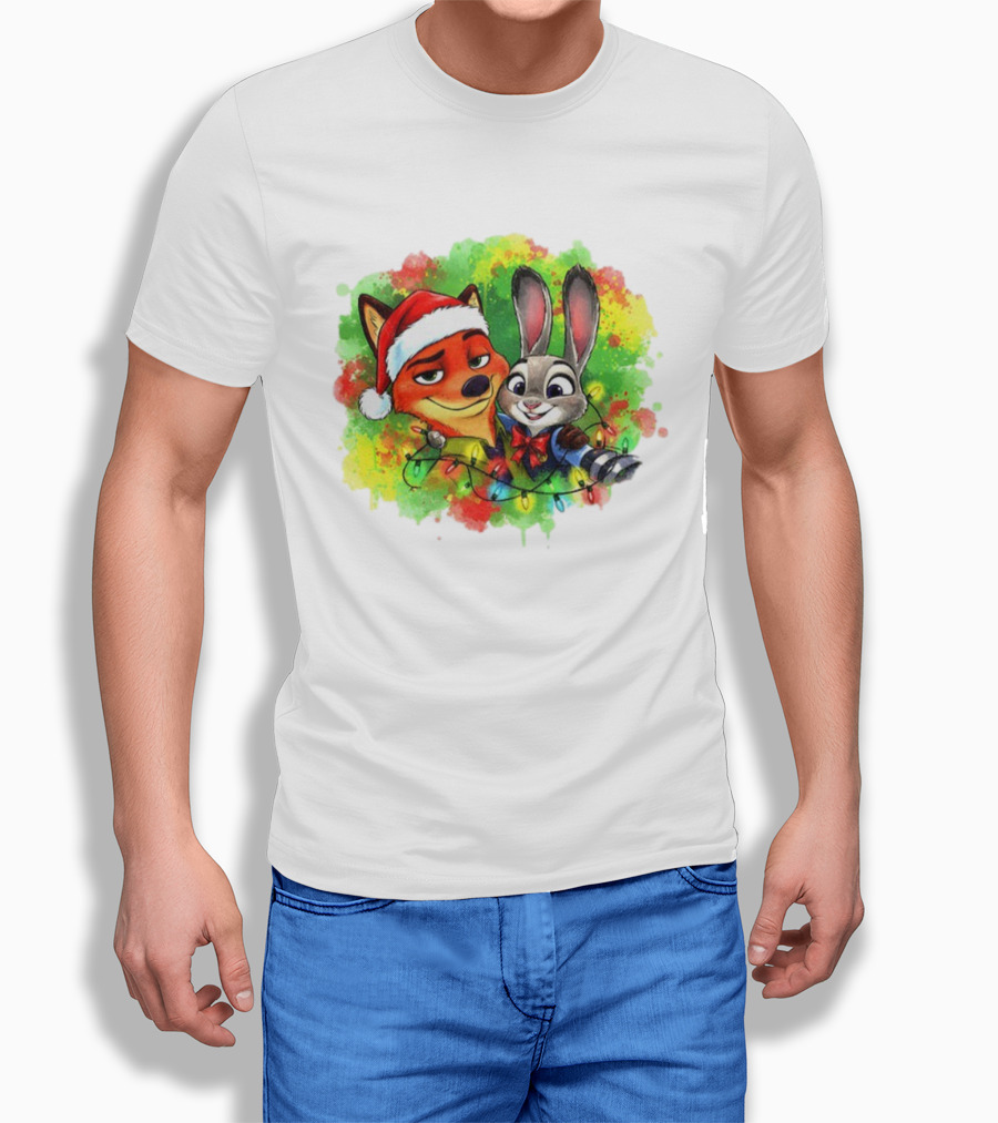 Couple Fox And Bunny Zootopia 2 Santa Hat Merry Christmas Holiday Lights T-Shirt