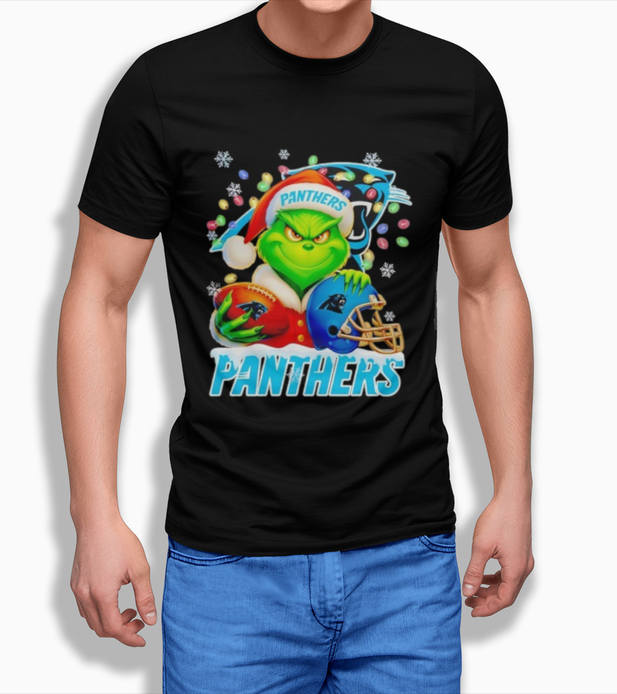 Grinch Santa Hat Holding Carolina Panthers Football And Helmet Merry Christmas T-Shirt