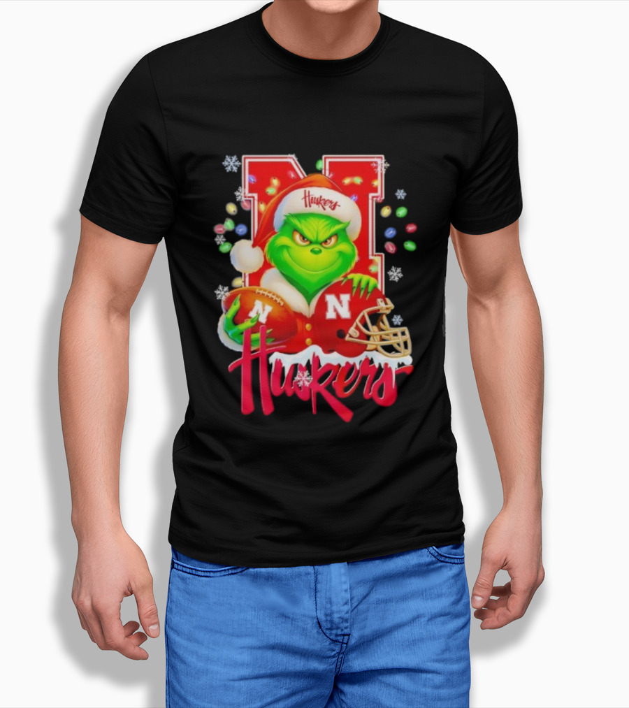 Grinch Santa With Nebraska Cornhuskers Helmet And Football Merry Christmas Huskers T-Shirt