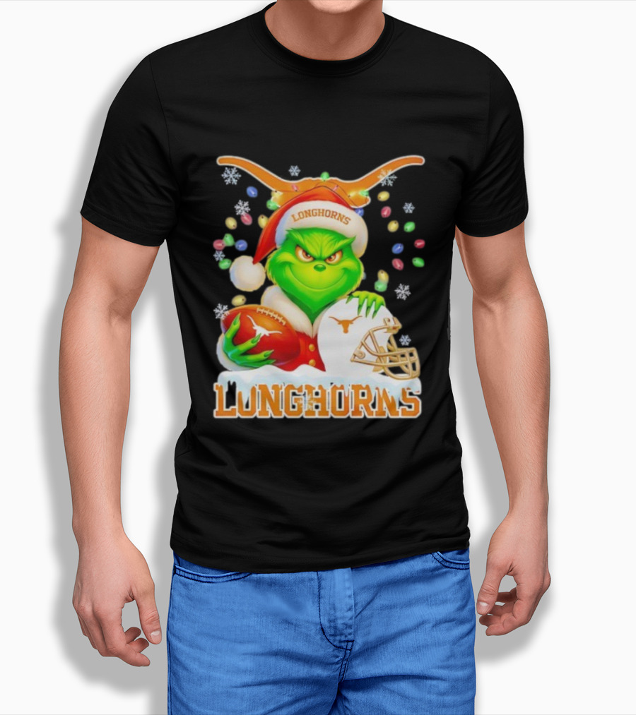 Grinch With Texas Longhorns Christmas Football Helmet And Santa Hat T-Shirt