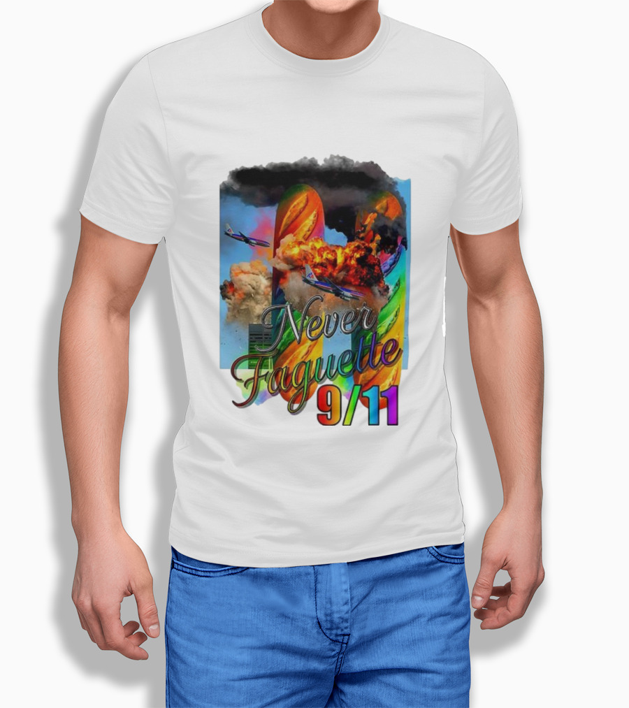 This T-Shirt features Never Faguette 9 11 The plane crashed into the bread print and is constructed from 100% ring-spun cotton fabric with a weight of 4.19 oz/yd² (142 g/m²). The fabric is pre-shrunk during manufacturing, a process intended to minimize dimensional changes after washing according to standard care instructions. Designed with a regular fit for everyday use, it incorporates double-needle stitching at key seams. Please refer to the size chart for detailed measurements.