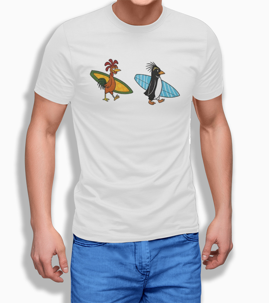 This T-Shirt features Joe And Cody Surfing Chicken And Penguin Adventure print and is constructed from 100% ring-spun cotton fabric with a weight of 4.19 oz/yd² (142 g/m²). The fabric is pre-shrunk during manufacturing, a process intended to minimize dimensional changes after washing according to standard care instructions. Designed with a regular fit for everyday use, it incorporates double-needle stitching at key seams. Please refer to the size chart for detailed measurements.