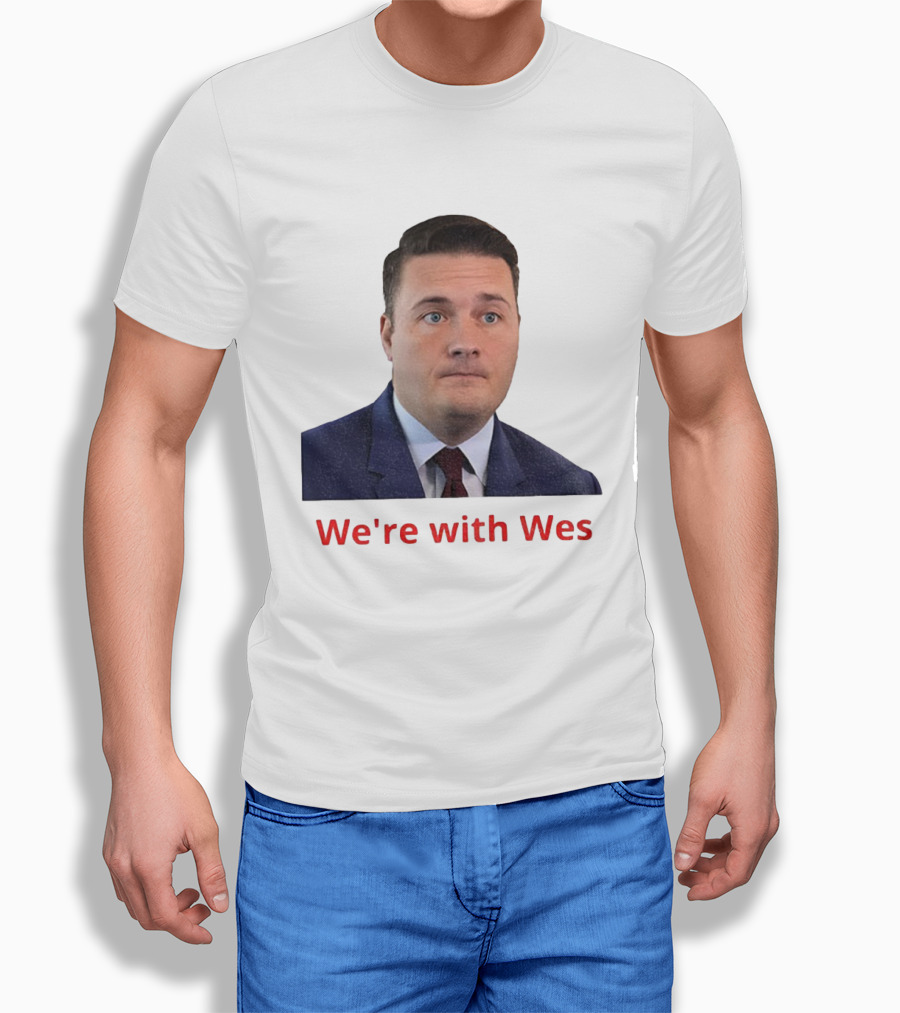 This T-Shirt features We're with Wes Streeting print and is constructed from 100% ring-spun cotton fabric with a weight of 4.19 oz/yd² (142 g/m²). The fabric is pre-shrunk during manufacturing, a process intended to minimize dimensional changes after washing according to standard care instructions. Designed with a regular fit for everyday use, it incorporates double-needle stitching at key seams. Please refer to the size chart for detailed measurements.