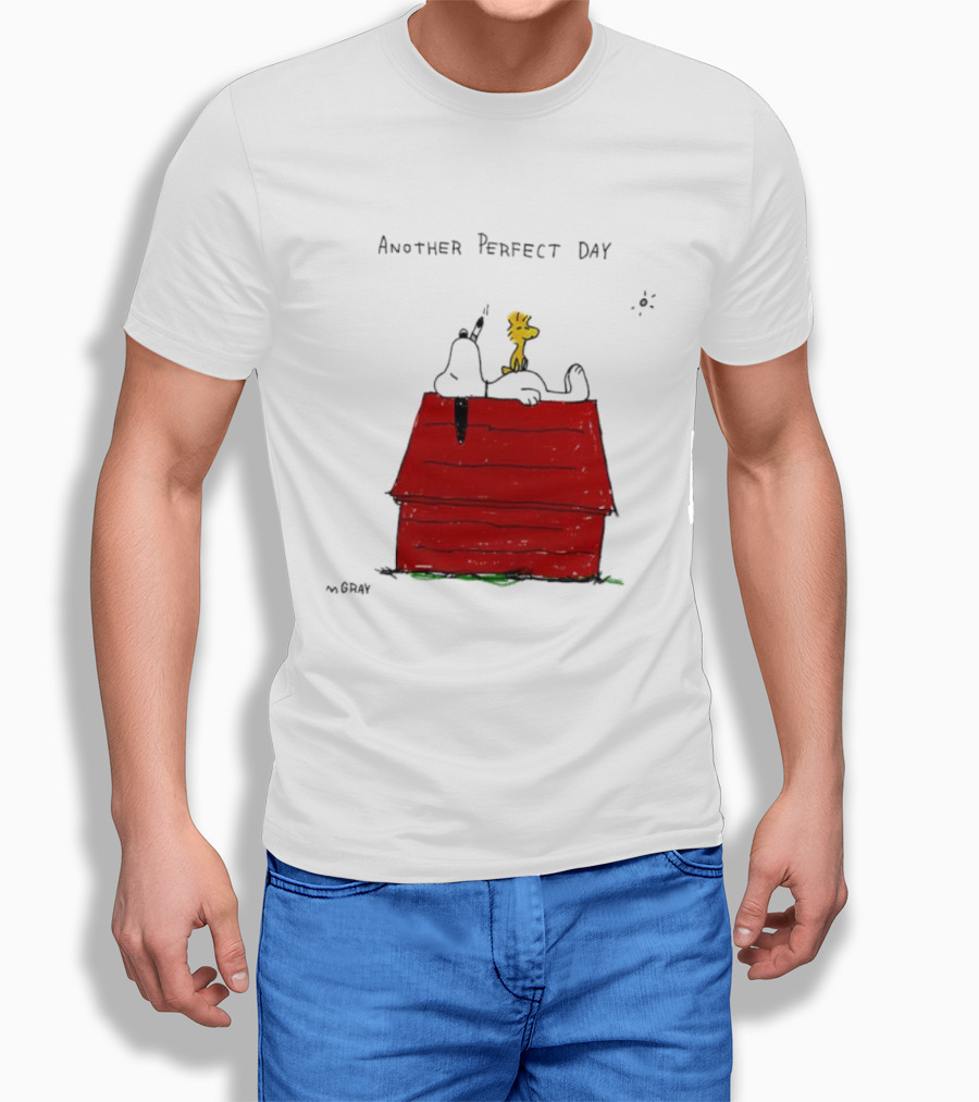 This T-Shirt features Snoopy and Woodstock Relaxing on Doghouse Perfect Day print and is constructed from 100% ring-spun cotton fabric with a weight of 4.19 oz/yd² (142 g/m²). The fabric is pre-shrunk during manufacturing, a process intended to minimize dimensional changes after washing according to standard care instructions. Designed with a regular fit for everyday use, it incorporates double-needle stitching at key seams. Please refer to the size chart for detailed measurements.