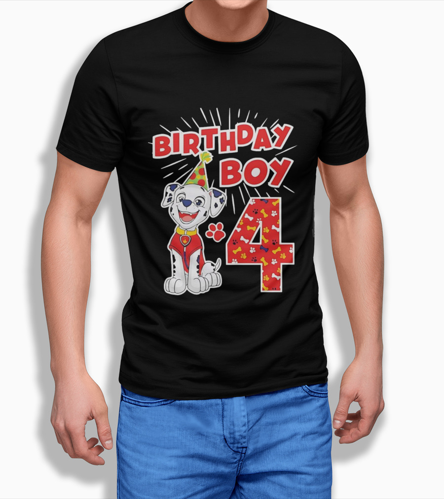 This T-Shirt features 4th Birthday Boy Celebration with Cute Pup and Party Hat print and is constructed from 100% ring-spun cotton fabric with a weight of 4.19 oz/yd² (142 g/m²). The fabric is pre-shrunk during manufacturing, a process intended to minimize dimensional changes after washing according to standard care instructions. Designed with a regular fit for everyday use, it incorporates double-needle stitching at key seams. Please refer to the size chart for detailed measurements.