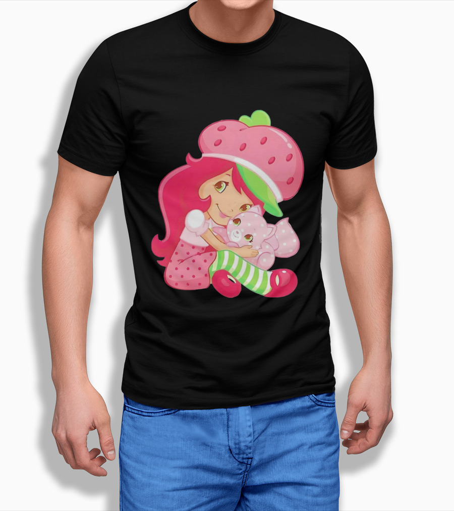 This T-Shirt features Strawberry Girl Hugging Pink Cat with Hat and Polka Dot Pants print and is constructed from 100% ring-spun cotton fabric with a weight of 4.19 oz/yd² (142 g/m²). The fabric is pre-shrunk during manufacturing, a process intended to minimize dimensional changes after washing according to standard care instructions. Designed with a regular fit for everyday use, it incorporates double-needle stitching at key seams. Please refer to the size chart for detailed measurements.