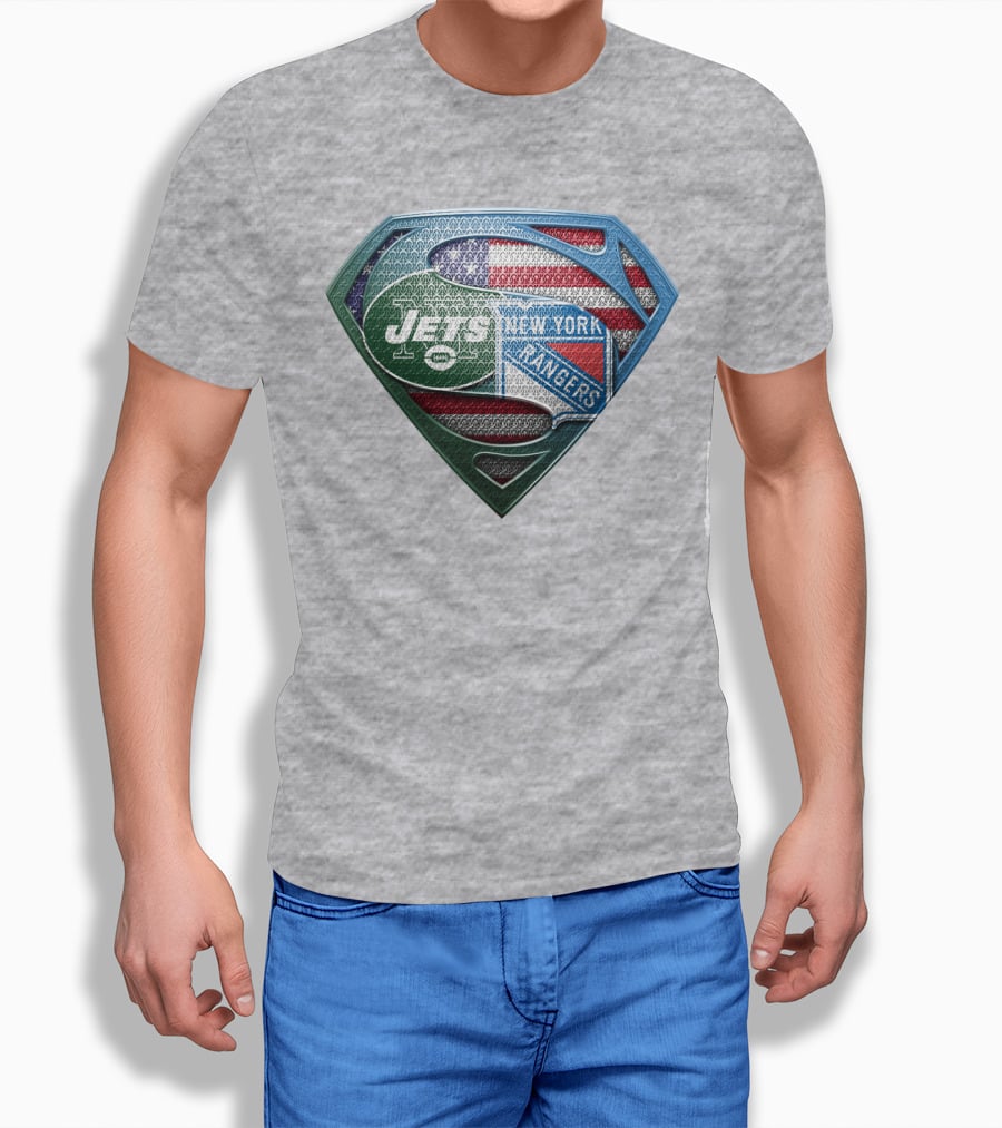 This T-Shirt features New York Jets Rangers American Flag Superhero print and is constructed from 100% ring-spun cotton fabric with a weight of 4.19 oz/yd² (142 g/m²). The fabric is pre-shrunk during manufacturing, a process intended to minimize dimensional changes after washing according to standard care instructions. Designed with a regular fit for everyday use, it incorporates double-needle stitching at key seams. Please refer to the size chart for detailed measurements.